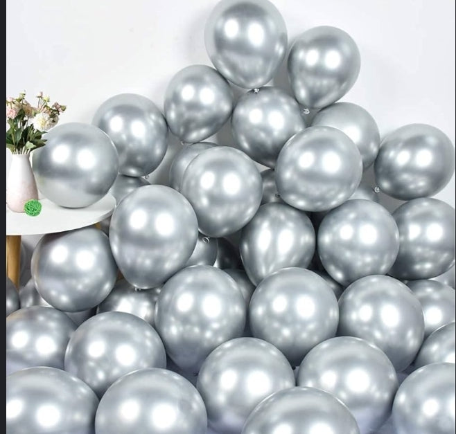 Premium metallic silver chrome balloons with brilliant mirror-like finish. Perfect for elegant events, corporate celebrations, New Year parties, or modern themed decorations. High-shine reflective surface creates stunning visual impact and photographs beautifully under various lighting conditions.